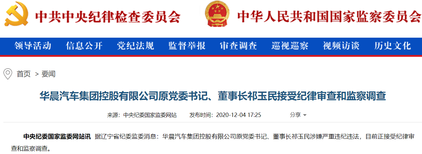 12月4日,據(jù)遼寧省紀委監(jiān)委消息,華晨汽車集團控股有限公司原黨委書記、董事長祁玉民涉嫌嚴重違紀違法,目前正接受紀律審查和監(jiān)察調(diào)查。