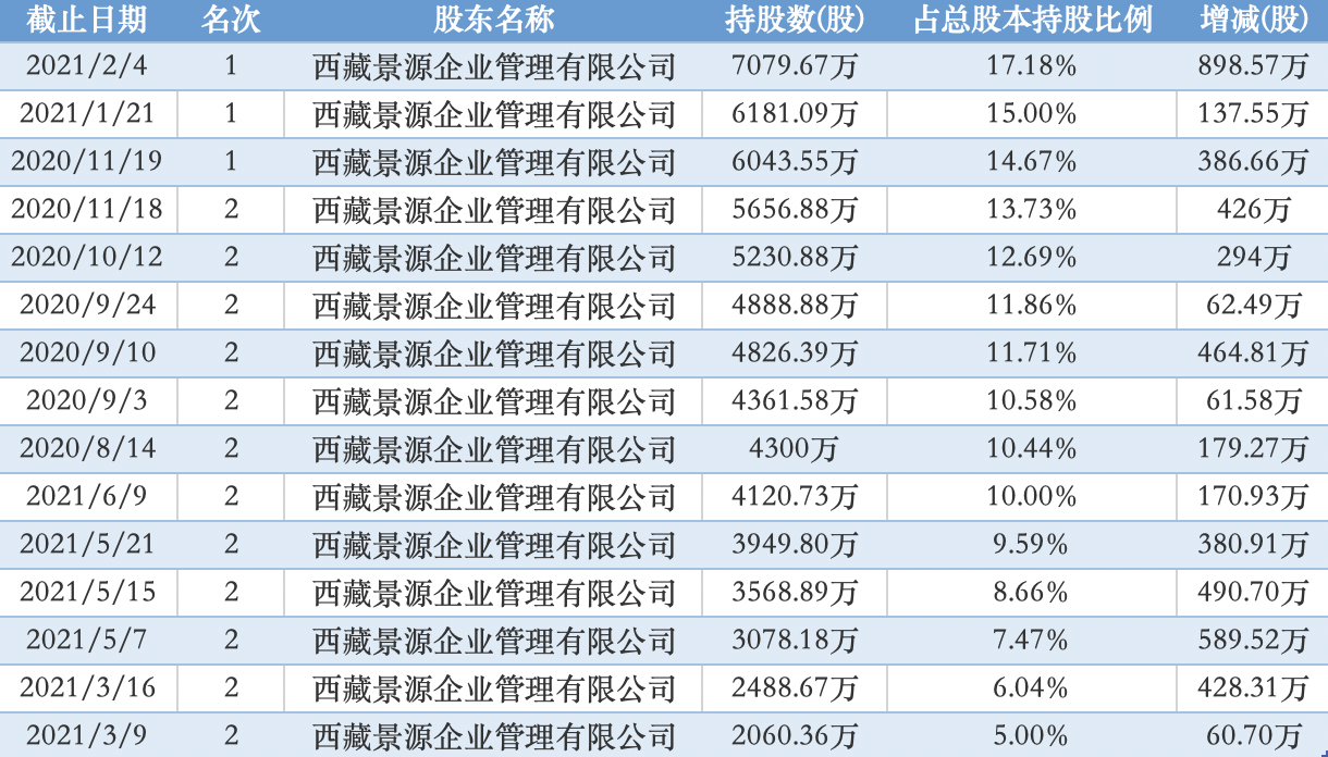 其中,西藏景源的持股是從2020年3月份第一次舉牌開(kāi)始,通過(guò)十五次增持,不到一年吃下的,按照成交價(jià)計(jì)算需6億元左右投入(見(jiàn)下圖)。