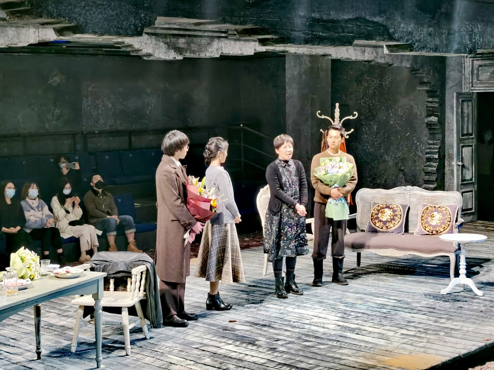 首演當(dāng)晚,導(dǎo)演林叢(右2)和三位主演一同謝幕。 澎湃新聞記者 王諍 圖