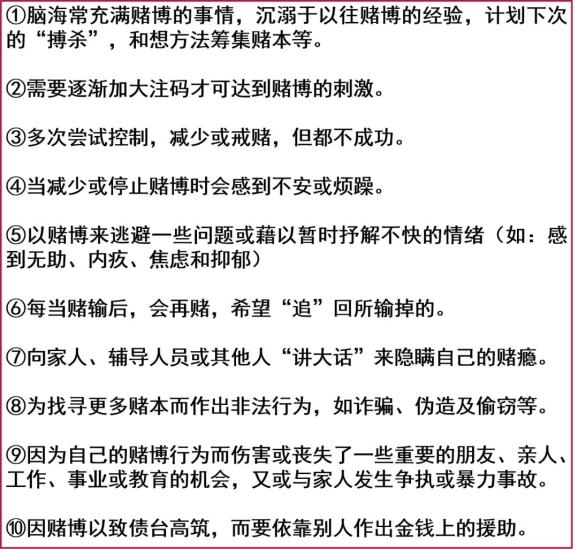 美國精神科協(xié)會出版的《精神疾病診斷與統(tǒng)計手冊第四版》列舉出了10項用來診斷病態(tài)賭徒的準(zhǔn)則。