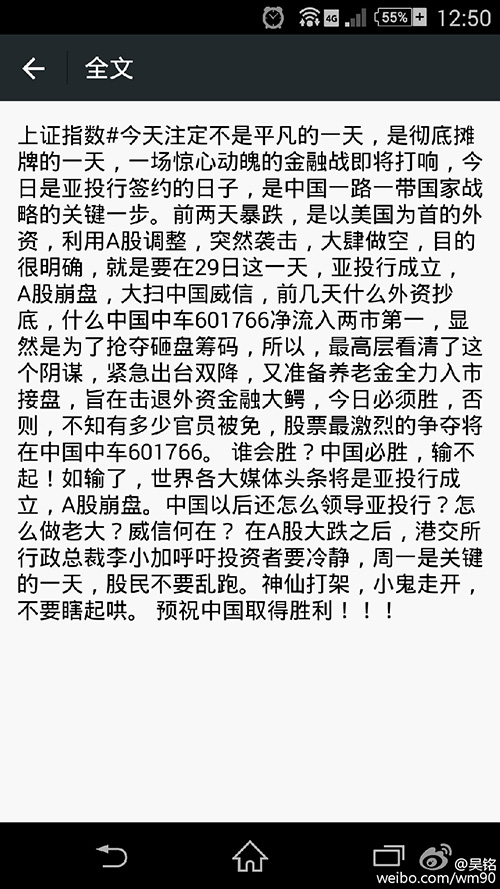 雖然救不了市,但是,中國股民已經(jīng)體現(xiàn)了他們的決心!不要在乎一城一地的失利,戰(zhàn)略性撤退是為獲取更大的勝利而爭取來的緩沖。最近的股市暴跌要辯證地看待,所謂多難興邦,大跌興股民,我們要從股市暴跌中看到好的一面,戰(zhàn)略性地藐視美帝,用積極的心態(tài)粉碎美帝的陰謀!