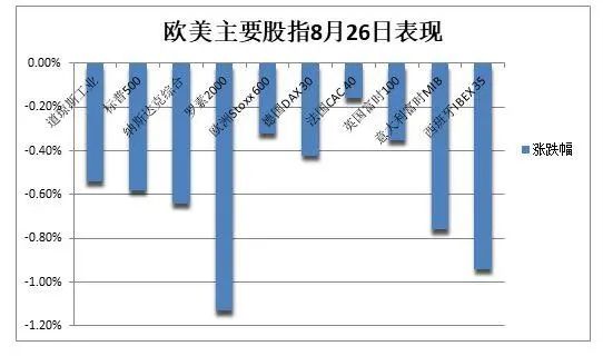 歐洲各主要國家股指普跌,英股止步四連漲,德股連跌兩日,外圍意大利富時MIB和西班牙IBES指數(shù)跌幅相對最深,意大利綜合股價銀行指數(shù)跌近1%。