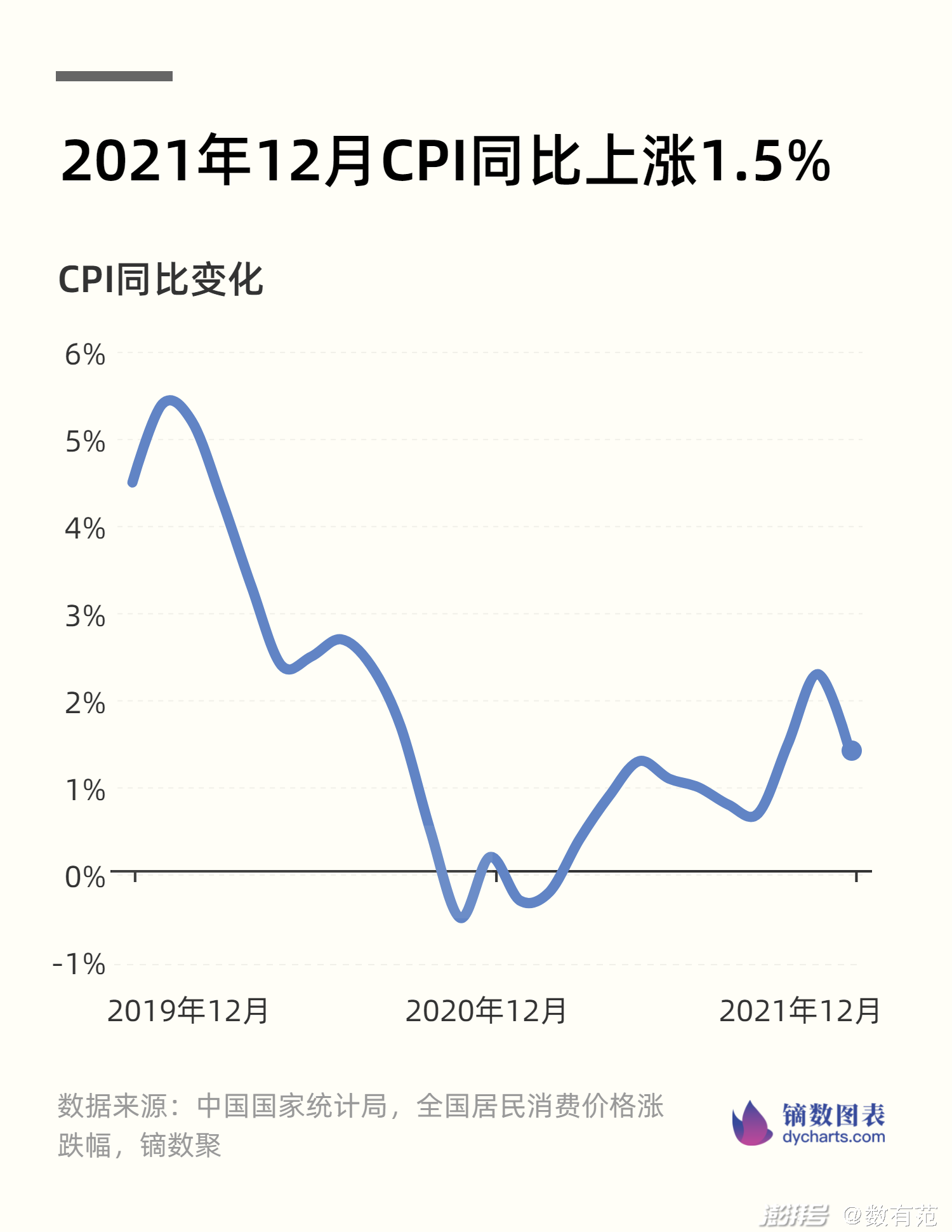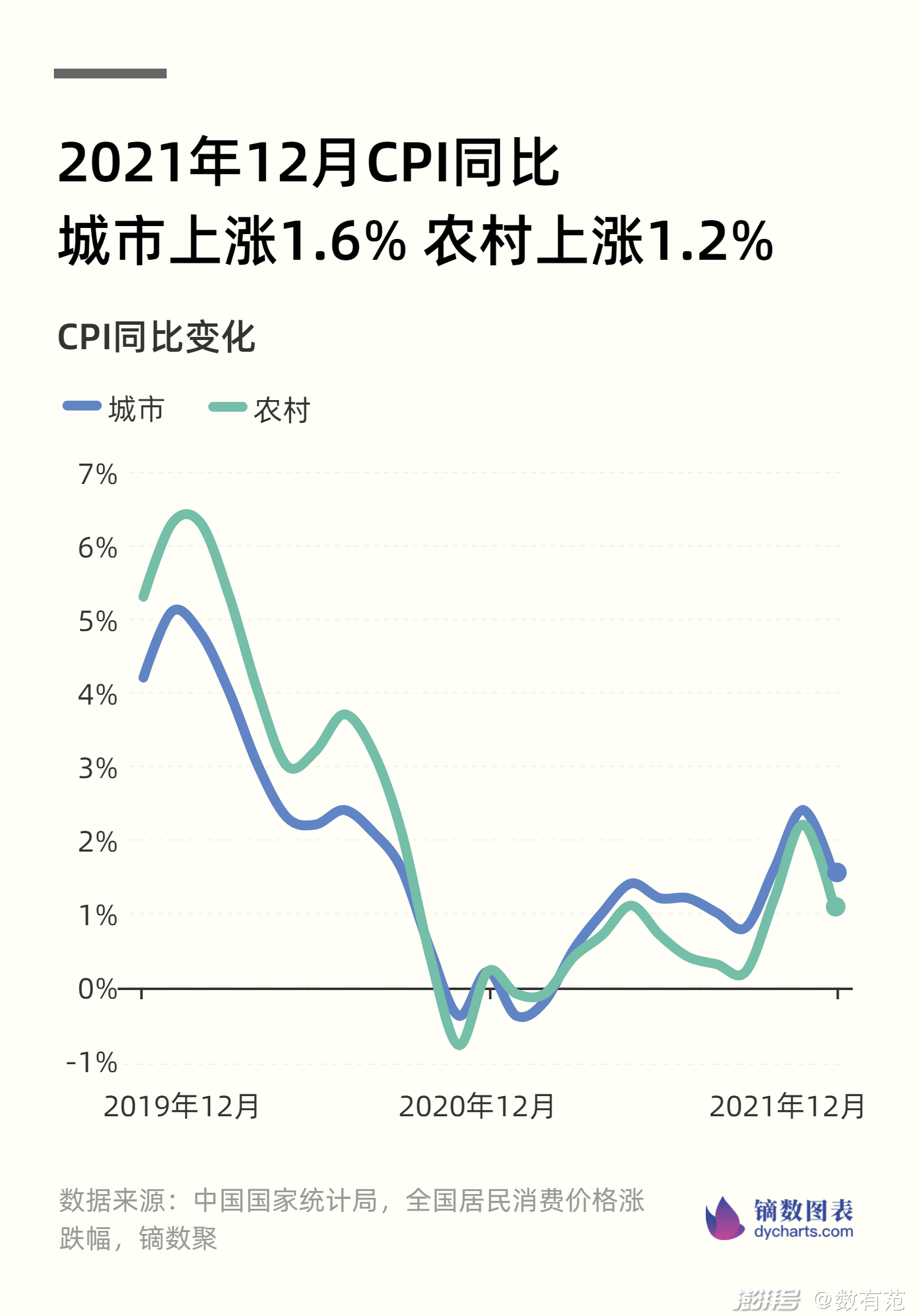 2021年12月,CPI同比上漲1.5%。其中,城市上漲1.6%,農(nóng)村上漲1.2%。