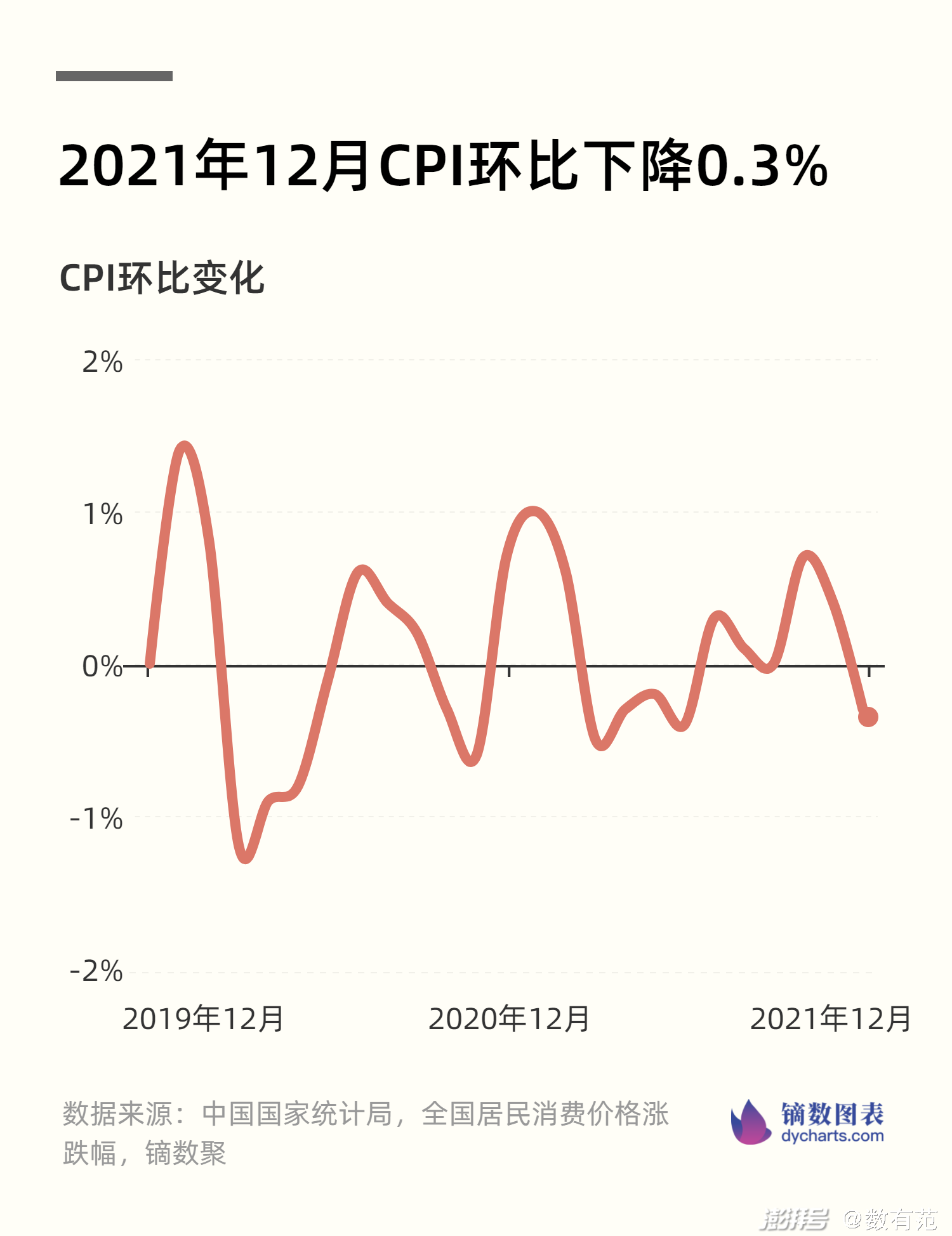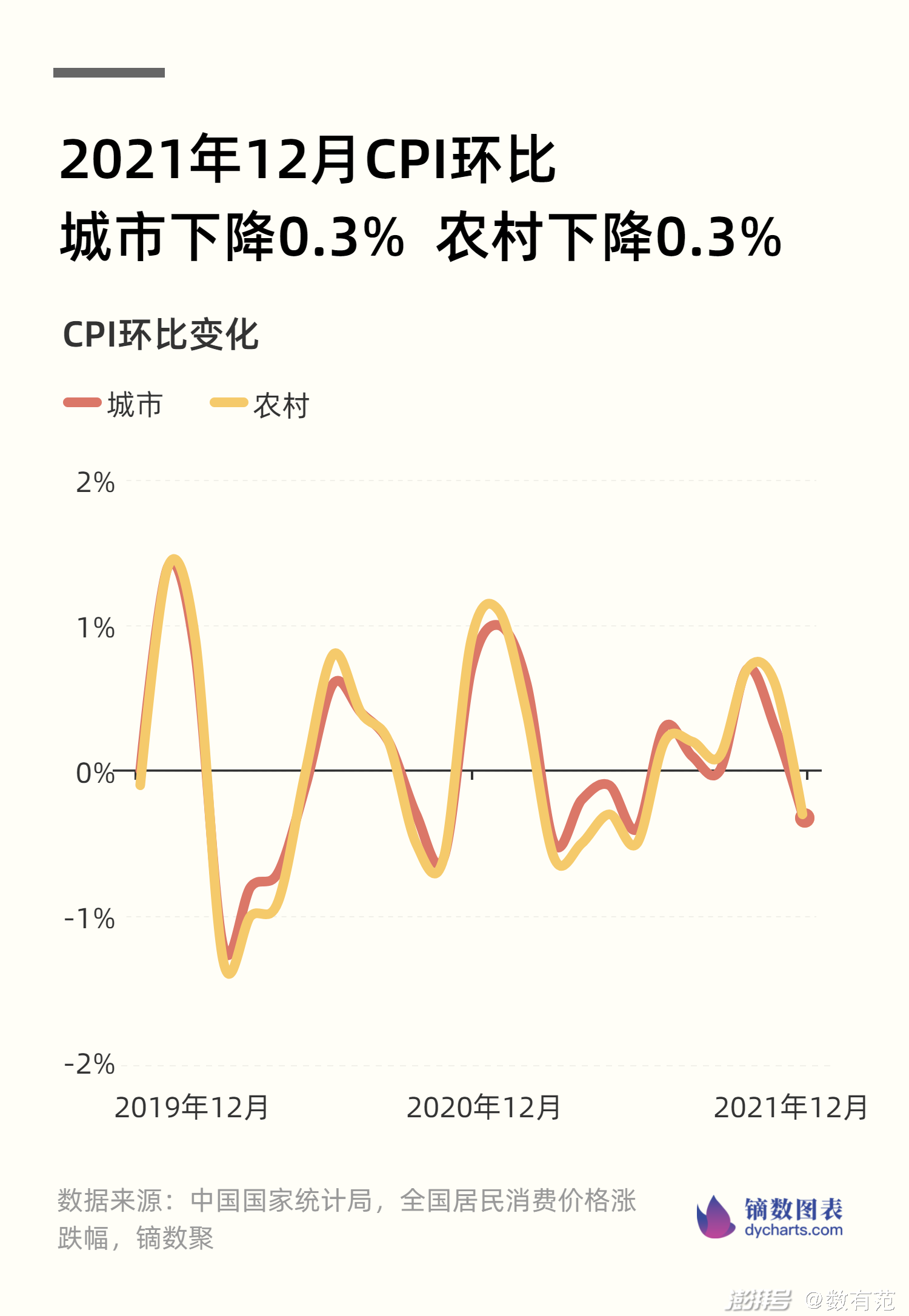 2021年12月,CPI環(huán)比下降0.3%。其中,城市下降0.3%,農(nóng)村下降0.3%。