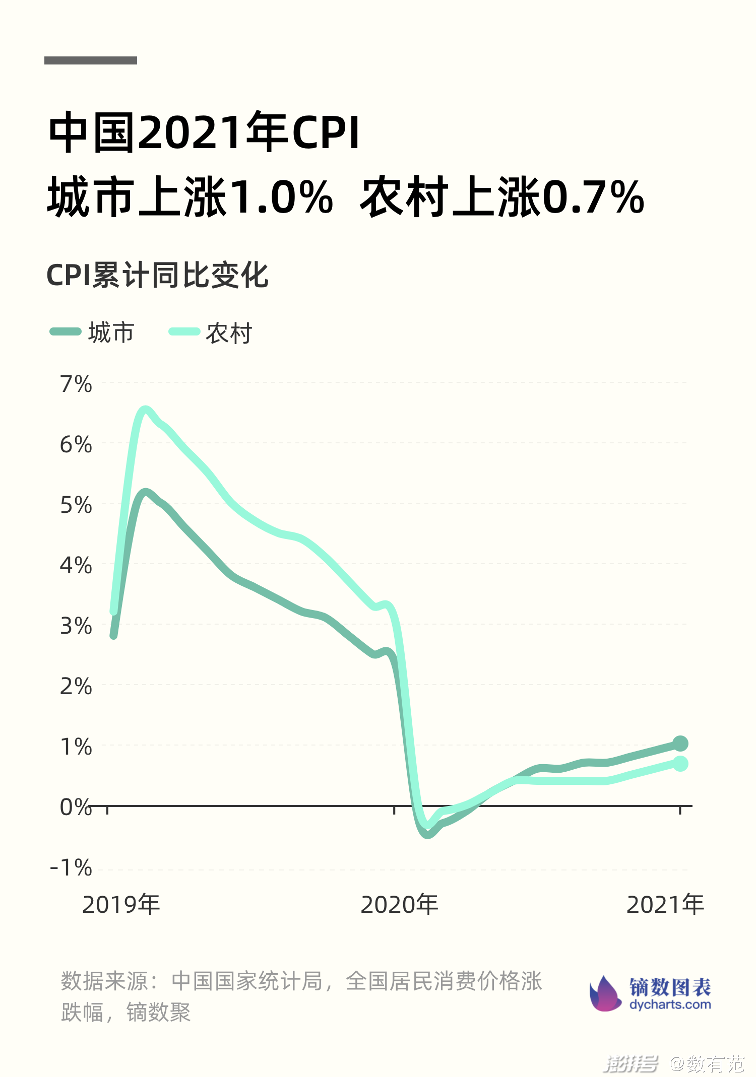 2021年全年,CPI累計(jì)同比城市上漲1.0%,農(nóng)村上漲0.7%,較2020年有所回落。