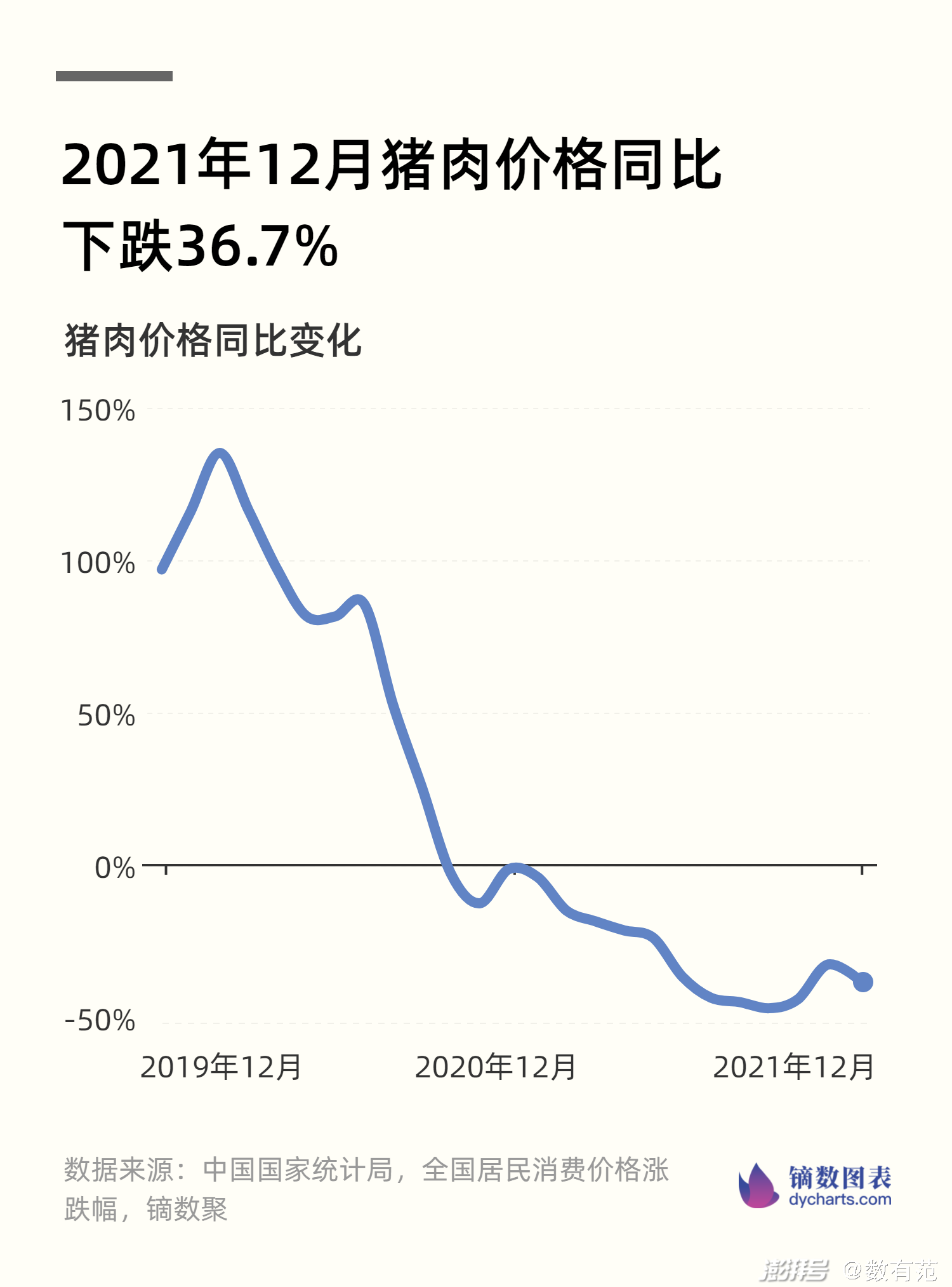 2021年12月豬肉價(jià)格下降36.7%,降幅比上月擴(kuò)大4.0個(gè)百分點(diǎn)。