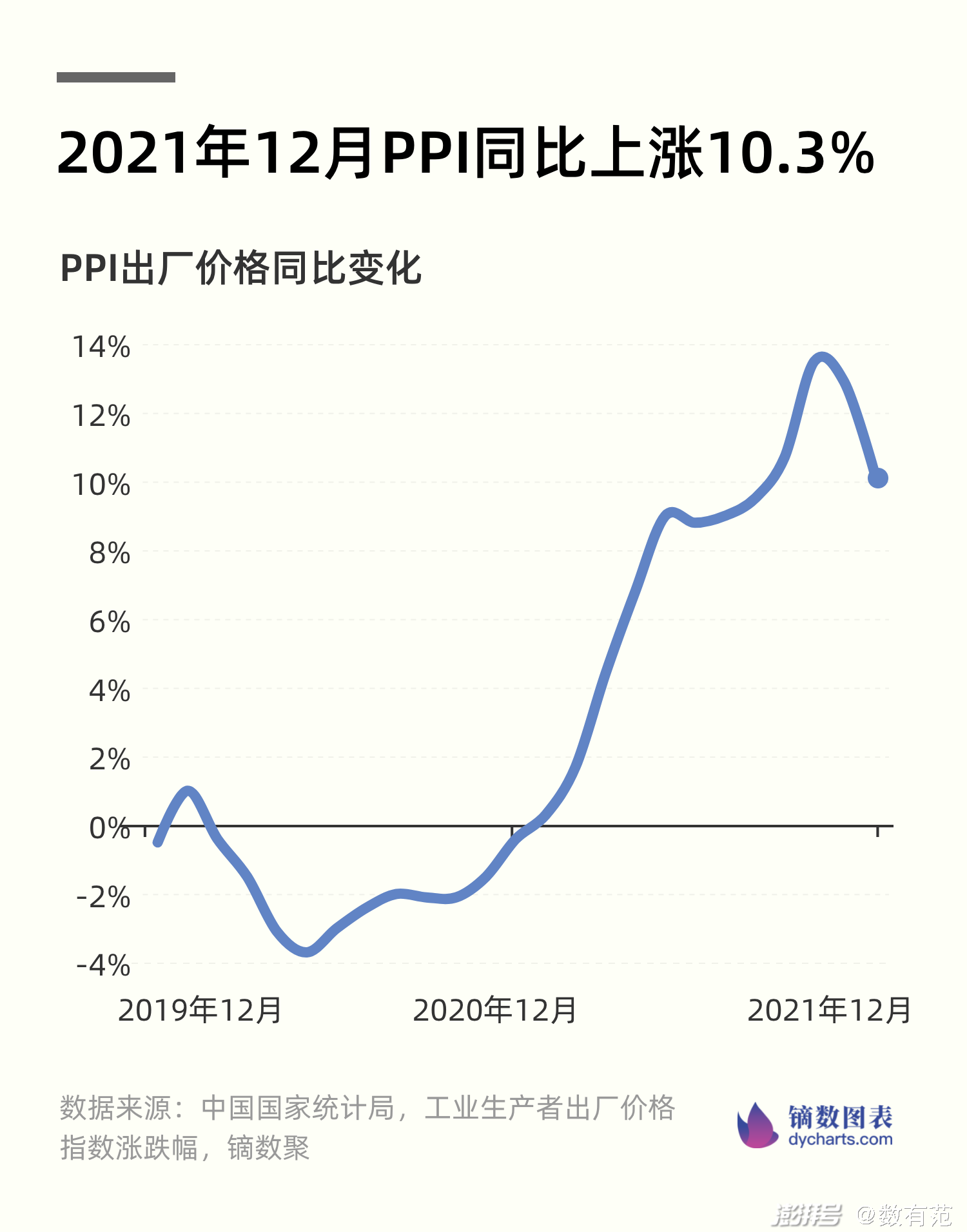 2021年12月,工業(yè)生產(chǎn)者出廠價(jià)格(PPI)同比上漲10.3%,漲幅比上月回落2.6個(gè)百分點(diǎn)。