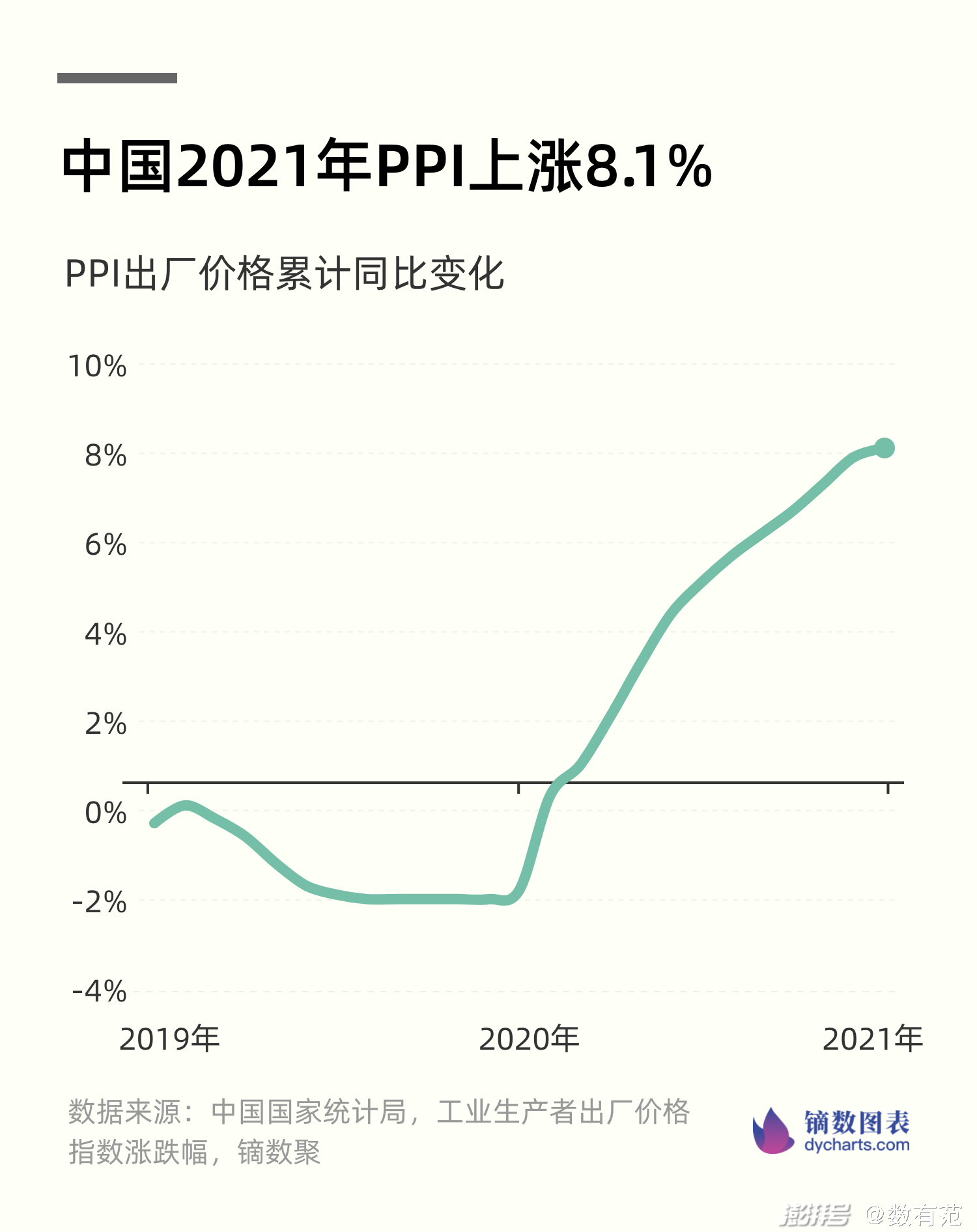 2021年全年,PPI累計(jì)同比上漲8.1%,較2020年明顯上漲。