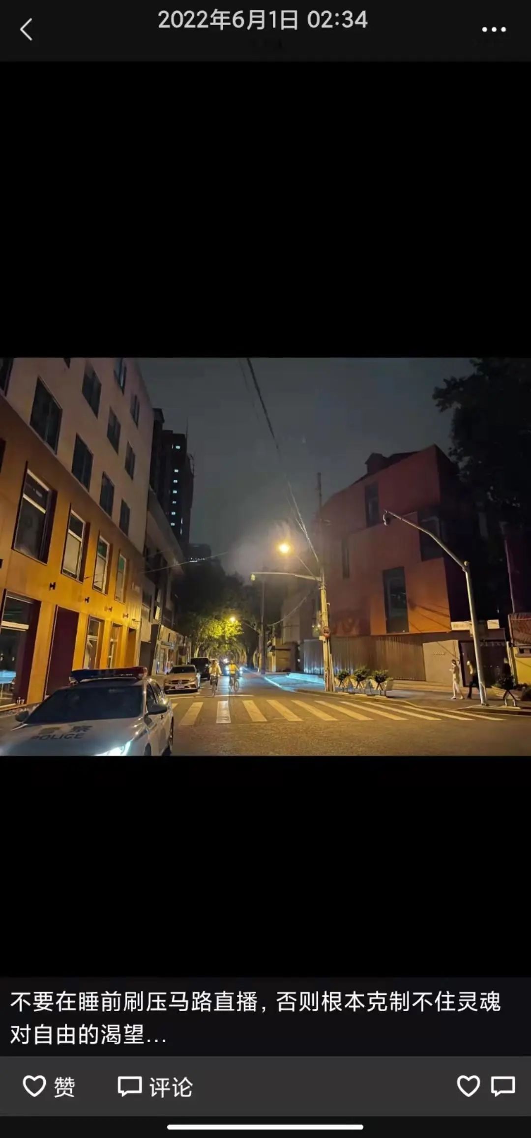 當天晚上,我輾轉(zhuǎn)反側(cè),激動得睡不著覺。碰巧在社交平臺上,看到一家媒體發(fā)起的“出門吧上?!?小時深夜慢直播活動,看著直播里大家一起在上海壓馬路的情景,我更是睡意全無,跟鄰居相約一起壓馬路。