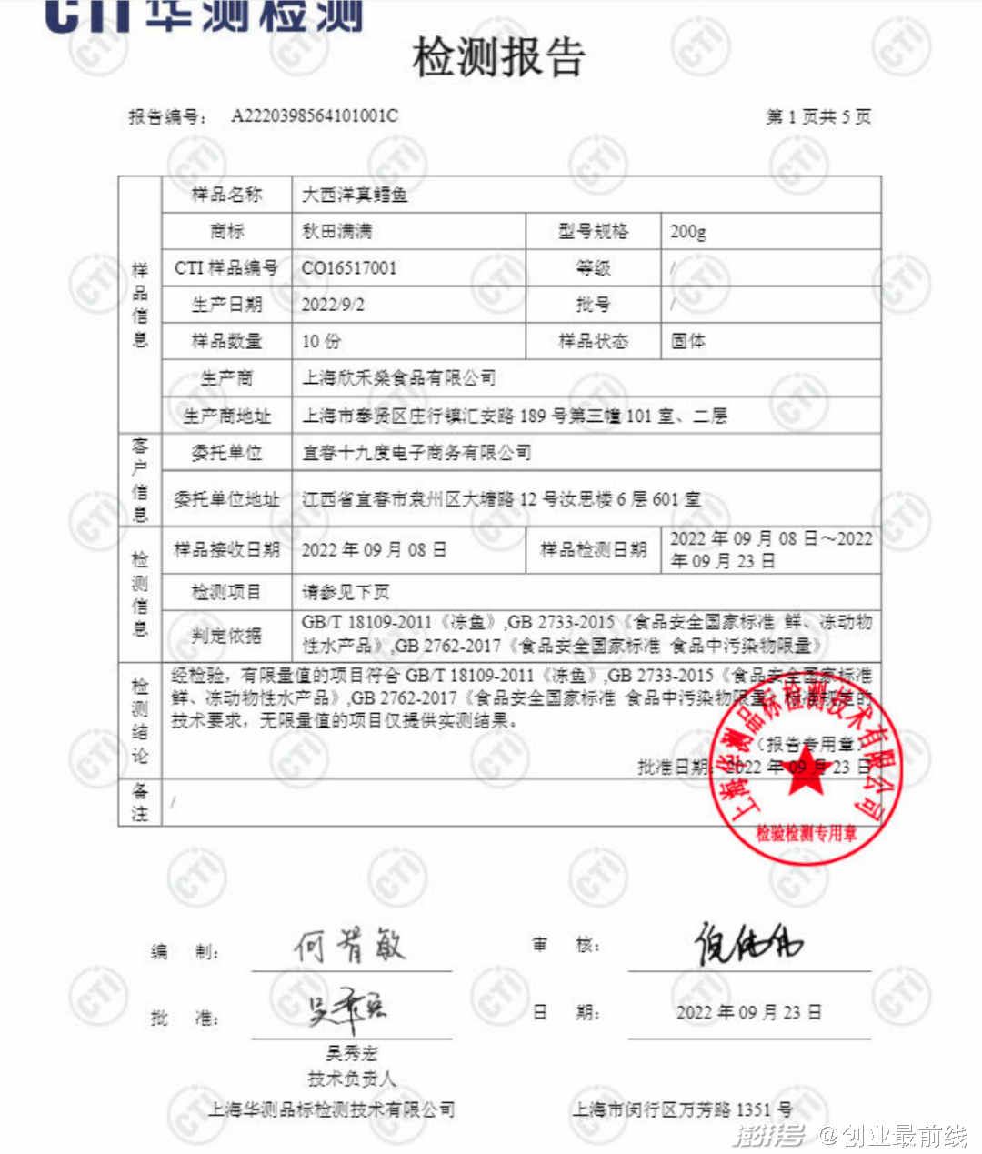 我們從秋田滿滿的客服手上拿到了一份最新的“大西洋真鱈魚(yú)”樣品檢測(cè)報(bào)告,屬于其現(xiàn)階段售賣(mài)的同一批次產(chǎn)品。報(bào)告顯示,其樣品生產(chǎn)日期為2022年9月2日,送檢時(shí)間為同年9月8日,且冷凍鱈魚(yú)保質(zhì)期為12個(gè)月。