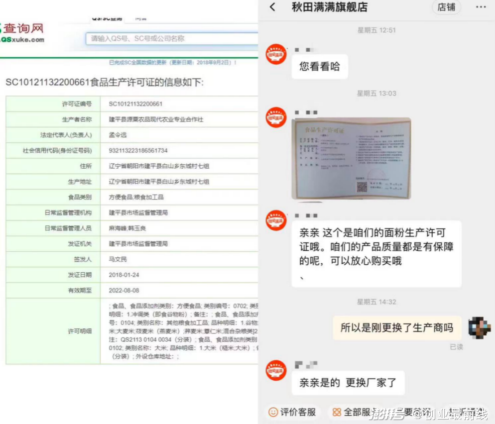(圖 / 左為原工廠生產(chǎn)許可證信息,客服供圖;右為與秋田滿滿客服對(duì)話截圖)