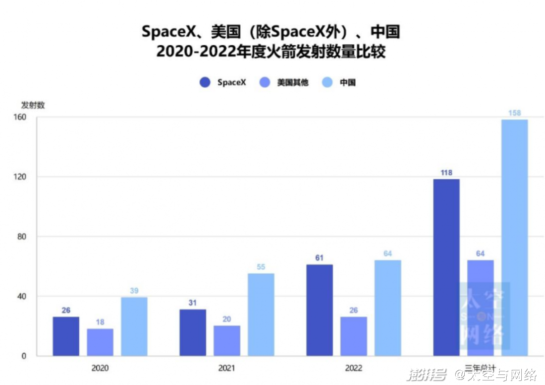 SpaceX、美國(除SpaceX外)以及中國三方的2020-2022年度火箭發(fā)射數(shù)量比較圖