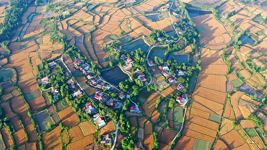 2022年5月17日,湖北省襄陽市南漳縣清河管理區(qū),被金色有機小麥環(huán)抱的美麗村莊。人民視覺 資料圖