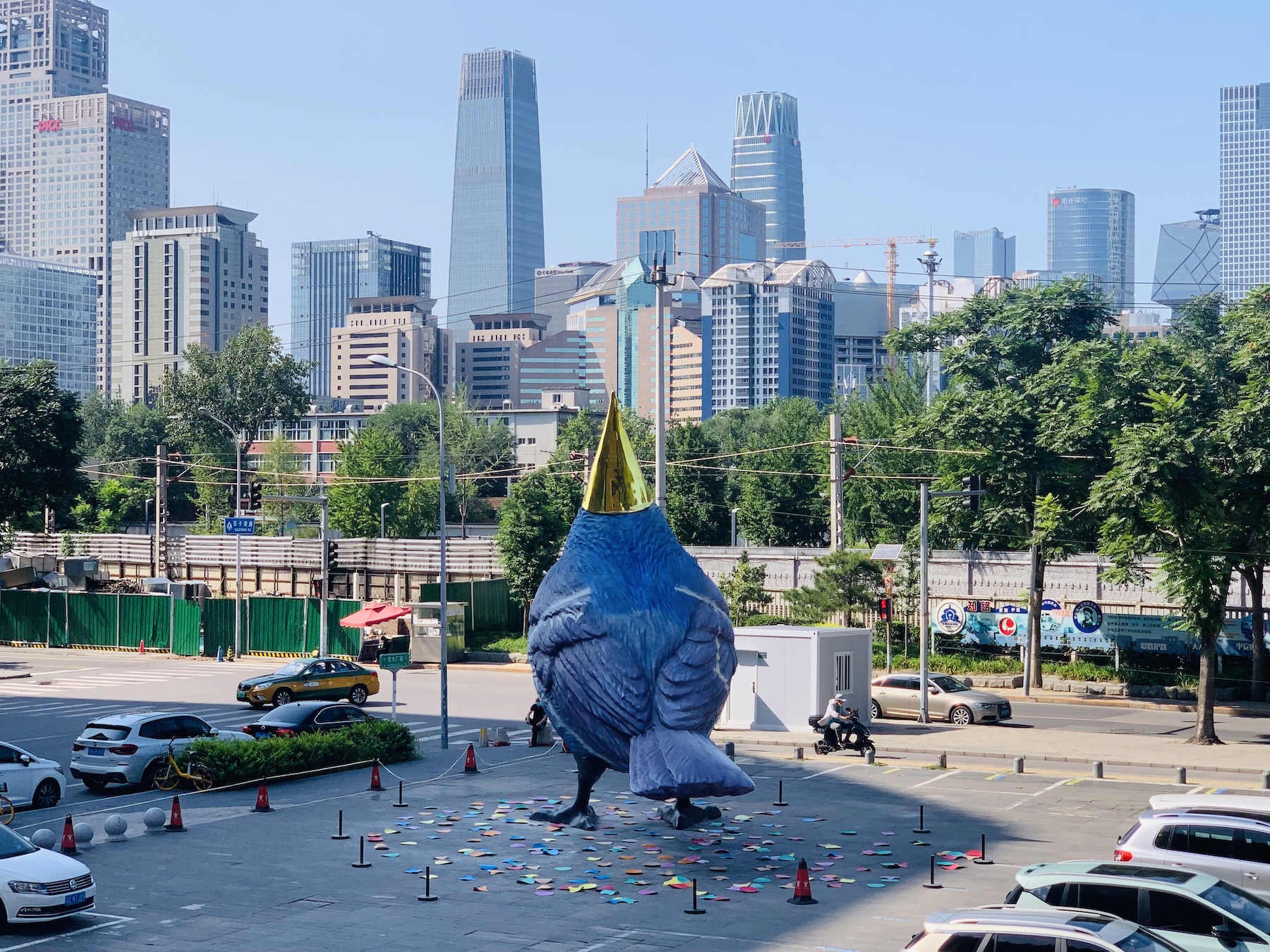 2007年,一只高26米的巨型橡皮鴨駛?cè)牒商m阿姆斯特丹港口,此后,“大黃鴨”風(fēng)靡網(wǎng)絡(luò),其創(chuàng)造者——藝術(shù)家弗洛倫泰因·霍夫曼也隨之聲名鵲起,去年在北京舉辦的“弗洛倫泰因·霍夫曼:歡聚!”展覽中,霍夫曼也帶來(lái)另外一件大型作品:一只戴著派對(duì)帽的小鳥(niǎo),它歡躍地佇立,望向不遠(yuǎn)處北京最繁華的地帶。