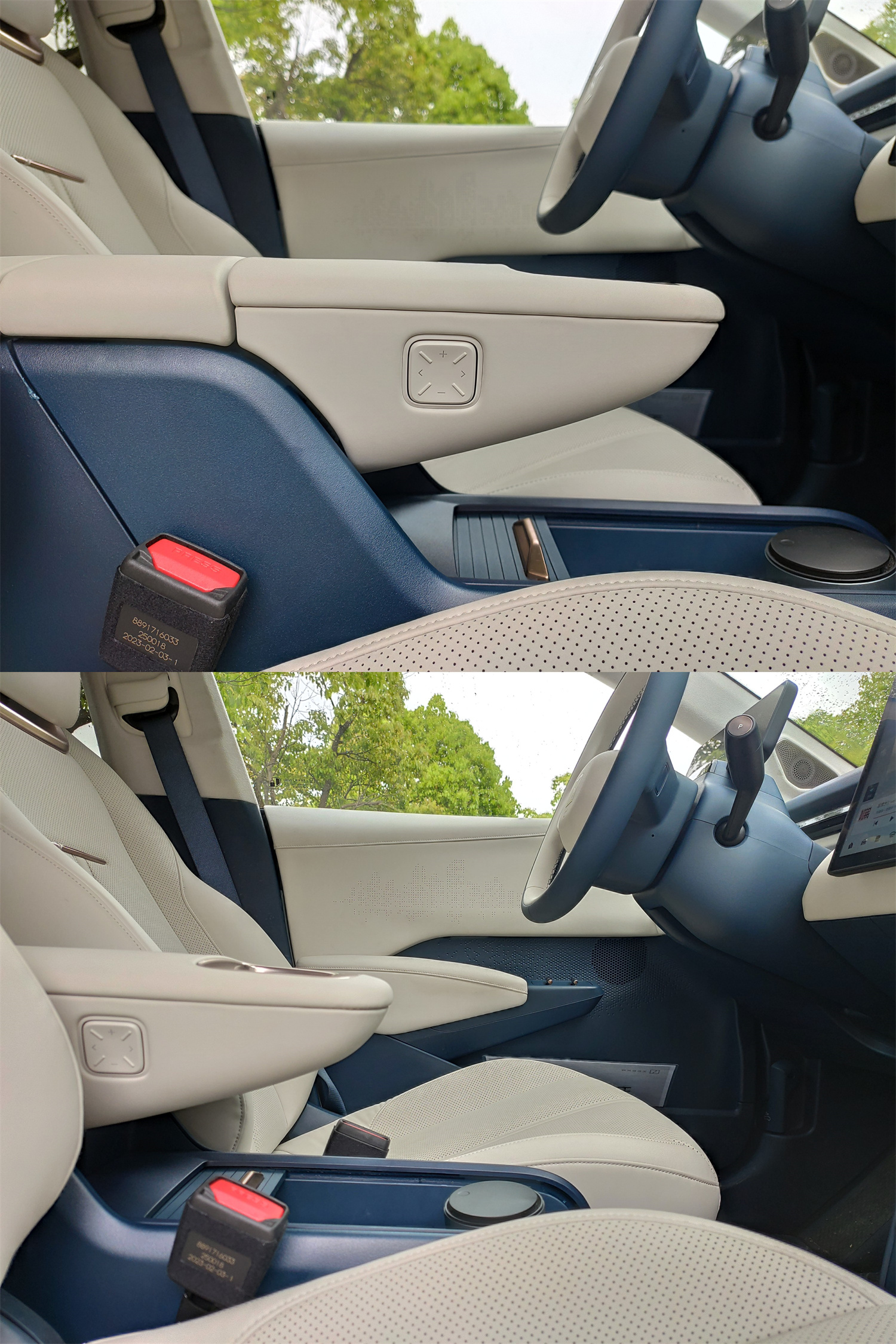 不光中控屏能移動,前排扶手也能通過側面按鍵前后移動