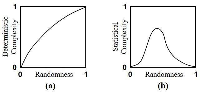 不確定性和系統(tǒng)的復(fù)雜程度有一定關(guān)聯(lián),所以信息論可以用來(lái)度量系統(tǒng)的復(fù)雜性。通常的直覺(jué)是,完全靜態(tài)有序的過(guò)程(具有固定狀態(tài))和完全無(wú)序或隨機(jī)的過(guò)程(具有完全不可預(yù)測(cè)的狀態(tài))具有最低復(fù)雜性。許多復(fù)雜性指標(biāo)試圖捕捉這一點(diǎn),比如統(tǒng)計(jì)復(fù)雜度(statistical complexity)。這一概念來(lái)自于計(jì)算力學(xué)的研究。相比于下圖(a)中的確定性復(fù)雜指標(biāo)(比如柯式復(fù)雜度),統(tǒng)計(jì)復(fù)雜度可以透過(guò)觀測(cè)數(shù)據(jù)捕捉到其背后的確定的規(guī)律。進(jìn)一步的,這種復(fù)雜性度量指標(biāo)可以用來(lái)量化涌現(xiàn)。