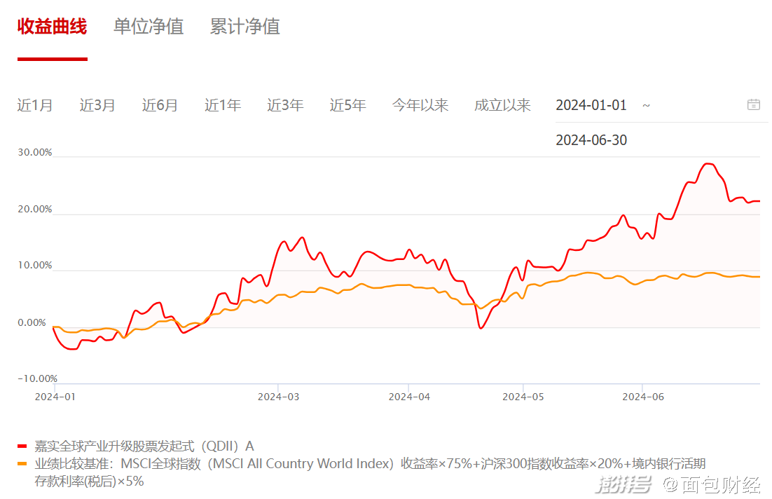 截至2024年6月30日,嘉實全球產業(yè)升級股票發(fā)起式(QDII)A上半年凈值上漲22.26%,跑贏業(yè)績比較基準超過14個百分點,同類排名1/70,表現(xiàn)較為突出。