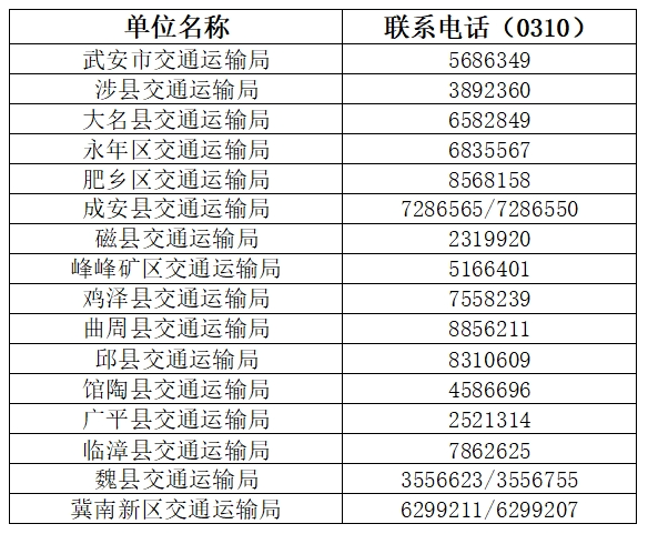 各縣(市、區(qū))交通運(yùn)輸部門(mén)聯(lián)系電話(huà)如下:
