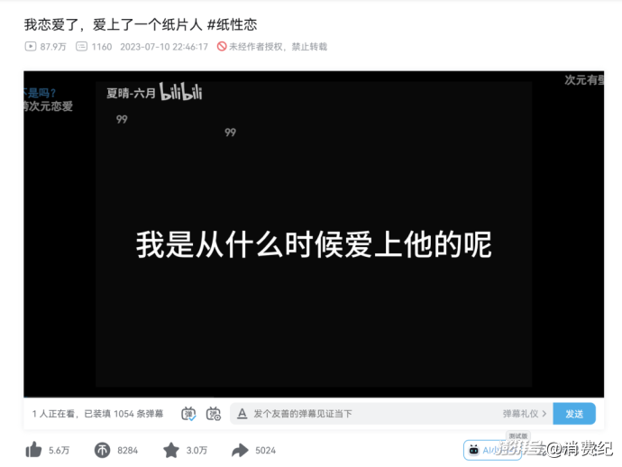 2023年7月,一則關于玩家與角色戀愛的視頻《我戀愛了,愛上了一個紙片人》在B站收獲了超過80萬的點擊量;2024年,《愛神的箭射穿我,卻只和你擦身而過》在B站創(chuàng)造了70萬點擊量。同時,在國內(nèi)規(guī)模最大的女性文學網(wǎng)站晉江文學城中,“紙片人” 標簽其下的搜索記錄多達近300頁......