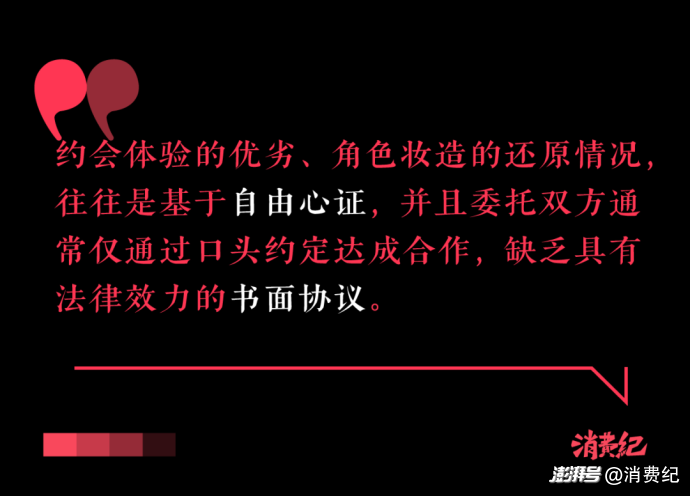 比如約會體驗的優(yōu)劣、角色妝造的還原情況,往往是基于自由心證,并且委托雙方通常僅通過口頭約定達成合作,缺乏具有法律效力的書面協(xié)議。一旦出現(xiàn)一方單方面毀約、逃避支付費用,或者單主對委托服務不滿意等情況,押金退還問題便會成為雙方矛盾的焦點。