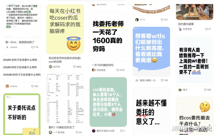 消費紀順著 “魚餅” 提供的信息,深入各個社交平臺進行瀏覽。在這個過程中,消費紀發(fā)現(xiàn),除了coser本身的服務費用,單主還需承擔一系列額外開銷:無論是與coser約會時的餐飲費用,還是因跨區(qū)域委托產(chǎn)生的差旅支出,都毫無例外地由單主買單。