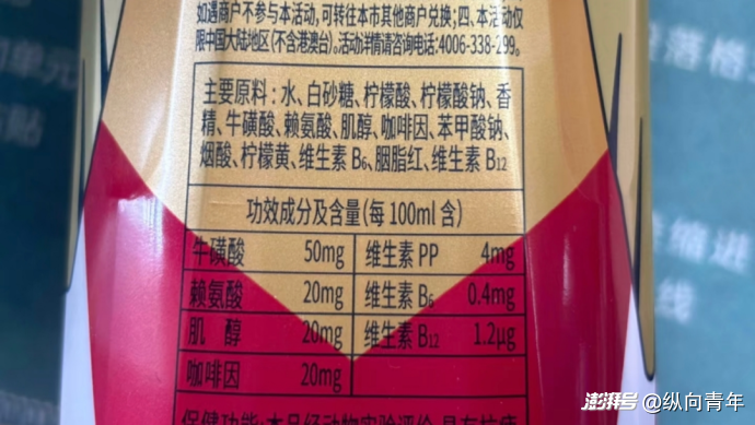 在飲料的配料表方面,東鵬特飲與紅牛高度重合,?;撬?、賴氨酸、肌醇、咖啡因,同時出現(xiàn)在兩者配料表上;其外包裝的設(shè)計風(fēng)格,以紅色、黃色相交織,也隱隱有著紅牛的影子。