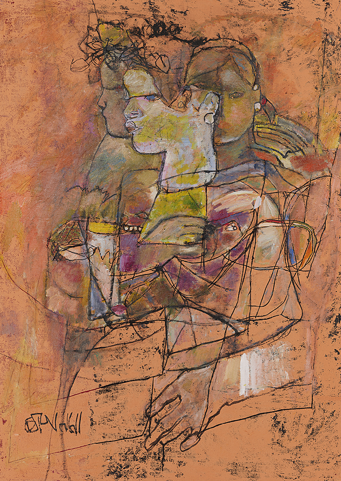石虎的重彩畫通過濃烈的礦物顏料與繁復(fù)的線條層疊,營(yíng)造出“絢爛而渾融”的視覺效果。石虎打破了傳統(tǒng)重彩的“單線平涂”程式,引入水墨的寫意性與油畫的肌理感。他通過多層色彩的疊加與局部脫落,模仿古代壁畫經(jīng)年累月的斑駁效果,同時(shí)借鑒水墨的虛實(shí)對(duì)比,使畫面既艷麗又渾厚。