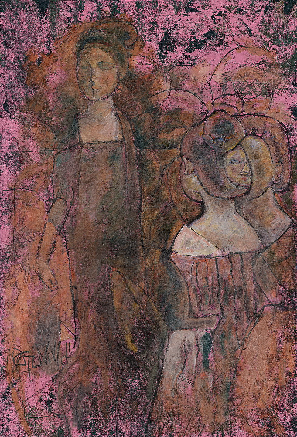 此幅作品富有濃郁的民族特色,線條極富韻味,有條不紊、優(yōu)美、流暢、變化無窮,表現(xiàn)出了音樂般的韻律感,構(gòu)成了豐富的視覺效果,又使得平面的物象有了空間的層次感,給人一種浪漫而神秘,裝飾而寫實(shí),平面而空間的藝術(shù)特色。石虎把無形的詩(shī)意變成可視可感的意象,他歌頌人間的美,歌頌自然的美,這是他獨(dú)特的個(gè)性寫照,是他人格涵養(yǎng),畫家將詩(shī)中的畫意化為獨(dú)特的情思,構(gòu)成了神秘、夢(mèng)幻、寧?kù)o而又高雅的意蘊(yùn)。