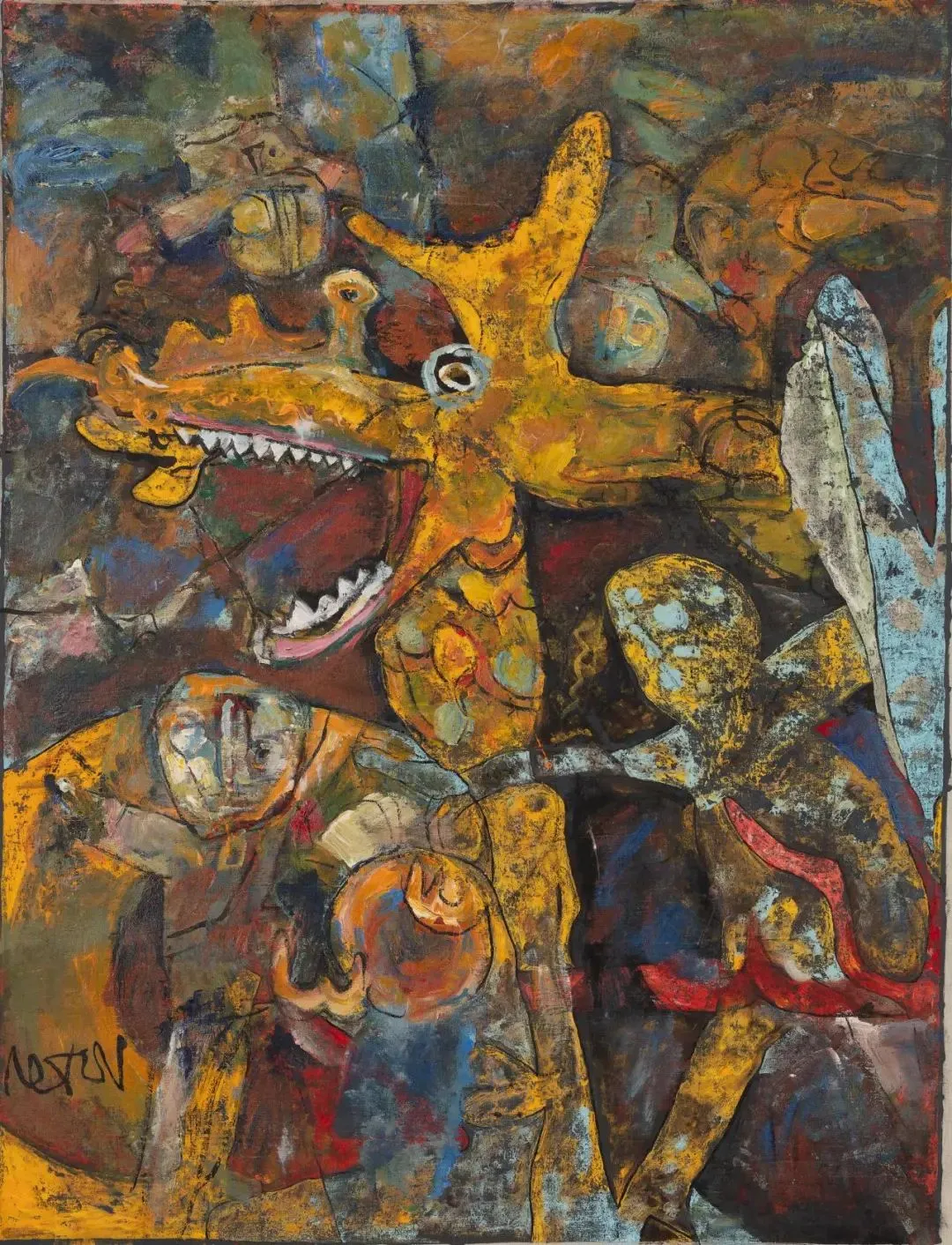 《歡天圖》的游龍不僅是節(jié)慶符號(hào),更承載著多重文化隱喻。龍身盤旋的形態(tài)暗合《周易》中“乾卦”的陽(yáng)剛之氣,而人群的歡騰場(chǎng)景則呼應(yīng)道家“天人合一”的哲學(xué)觀。畫面中,龍眼以夸張的圓形瞳孔凝視觀者,既似民間社火面具的詼諧,又帶有原始巖畫的野性張力。畫面邊緣散落的甲骨文式符號(hào),則暗示漢字思維對(duì)藝術(shù)表達(dá)的深層影響。這種將個(gè)人情感與集體記憶融合的創(chuàng)作方式,既是對(duì)85美術(shù)思潮后盲目西化風(fēng)潮的反撥,也體現(xiàn)了藝術(shù)家“從民間尋找中國(guó)藝術(shù)真諦”的自覺。