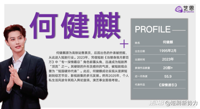 曾為高鐵站售票員的何健麒,2023 年因《當(dāng)替身我月薪百萬(wàn)》中 "專(zhuān)一深情霸總" 角色嶄露頭角。其硬朗深邃的五官、痞帥亦正亦邪的氣質(zhì),迅速成為 "短國(guó)硬帥" 代表。在《深情誘引》中,他與王格格合作打造的都市情感劇,以精良制作和細(xì)膩演技成為 "短劇天花板",小紅書(shū)話題超 3000 萬(wàn)次,觀眾評(píng)價(jià)其 "吻戲少但封神,演技與顏值并存"。
