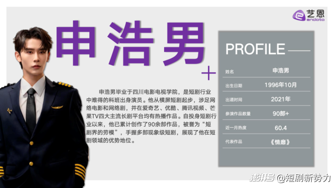 畢業(yè)于四川電影電視學(xué)院的申浩男,是四位演員中唯一科班出身的 "學(xué)院派"。自 2021 年出道以來(lái),他累計(jì)參演 90 余部作品,堪稱(chēng) "高產(chǎn)標(biāo)兵"。從橫屏短劇到網(wǎng)絡(luò)電影,從愛(ài)奇藝到芒果 TV,他的作品覆蓋全平臺(tái),形成了 "鐵打的申浩男,流水的女主角" 的行業(yè)佳話。