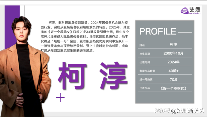 非科班出身的柯淳,2024 年因偶然機(jī)會(huì)進(jìn)入短劇行業(yè),完成從零售業(yè)到演藝圈的跨界轉(zhuǎn)型。2025 年,其主演的《好一個(gè)乖乖女》以超 20 億播放量成為年度現(xiàn)象級(jí)作品,單集最高播放量近 1 億次。劇中,他塑造的 "純愛(ài)霸總" 形象顛覆傳統(tǒng)認(rèn)知,通過(guò)細(xì)膩的眼神戲和層次感極強(qiáng)的哭戲,將角色的深情與脆弱展現(xiàn)得淋漓盡致,被觀眾稱(chēng)為 "短國(guó)哭戲第一人",相關(guān)片段在抖音、小紅書(shū)等平臺(tái)二次創(chuàng)作量超 100 萬(wàn)條,# 柯淳模仿秀 #話題瀏覽量破億。