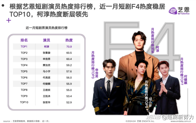 2025 年,中國(guó)短劇市場(chǎng)迎來(lái)井噴式發(fā)展。據(jù)藝恩營(yíng)銷(xiāo)智庫(kù)數(shù)據(jù)顯示,行業(yè)年播放量突破 500 億次,用戶規(guī)模超 8 億,形成了獨(dú)特的內(nèi)容生態(tài)和受眾群體。在這樣的背景下,四位新生代演員 —— 柯淳、申浩男、馬小宇、何健麒憑借卓越表現(xiàn)脫穎而出,被觀眾親切稱(chēng)為 "短劇 F4"。他們不僅打破了傳統(tǒng)短劇演員的局限性,更以驚人的速度向主流娛樂(lè)圈滲透,成為連接短劇與長(zhǎng)劇生態(tài)的關(guān)鍵橋梁。