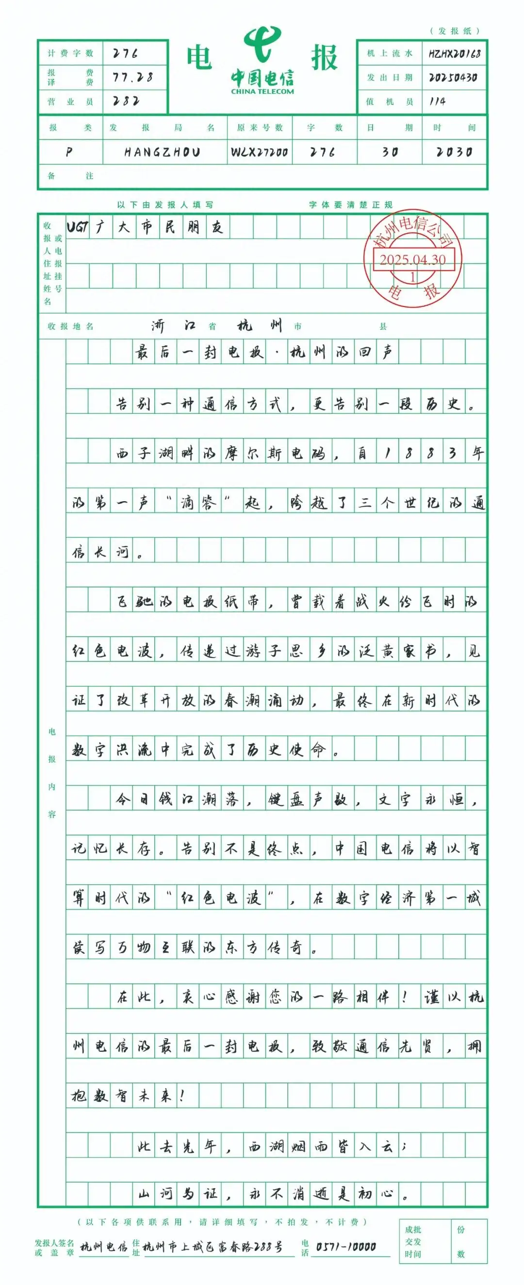 中國電信杭州分公司的通知發(fā)布后,網(wǎng)友們從全國各地涌向杭州武林廣場電信營業(yè)廳。僅4月26日一天,武林廣場營業(yè)廳就發(fā)出了1300多封電報(bào),而近幾年,每年的電報(bào)量早已降到20-30份。