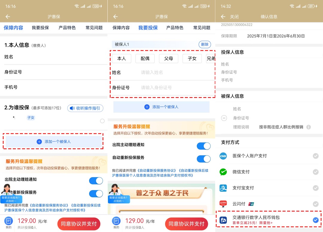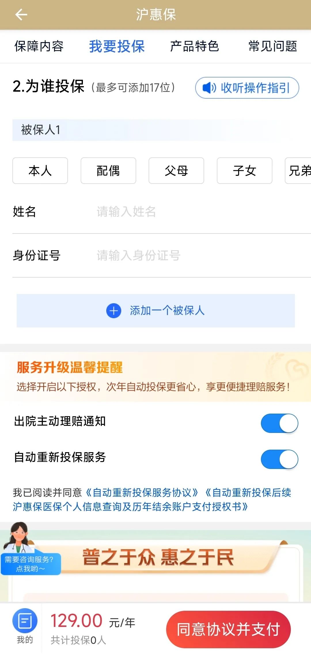 如往期未投保過的,則點(diǎn)擊“添加一個被保人”→選擇并輸入被保人的個人信息(姓名、身份證)。