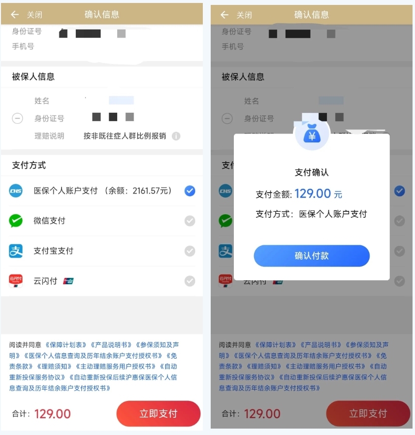 以“醫(yī)保個人賬戶支付”舉例:支付方式點(diǎn)選“醫(yī)保個人賬戶支付”→點(diǎn)擊頁面底部的“立即支付”→確認(rèn)彈窗中被保人有無大病就診記錄,及相應(yīng)的報銷比例等提示信息。確認(rèn)后,點(diǎn)擊“已知曉,同意投保”→點(diǎn)擊“確認(rèn)付款”,完成保費(fèi)支付。