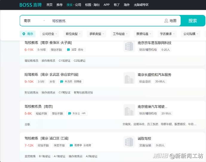 在BOSS直聘上搜索“駕校教練”,結(jié)果顯示南京的職位待遇在5000-11000元不等,石亞萍透露,實際工資遠沒有這么高,她的工資由底薪(2490元,南京市月最低工資)與績效(招一個學(xué)生150元+考出去一個學(xué)生150-300元,按班型調(diào)整)構(gòu)成,沒有一金,五險從工資里扣除一部分,她形容為“羊毛出在羊身上”。