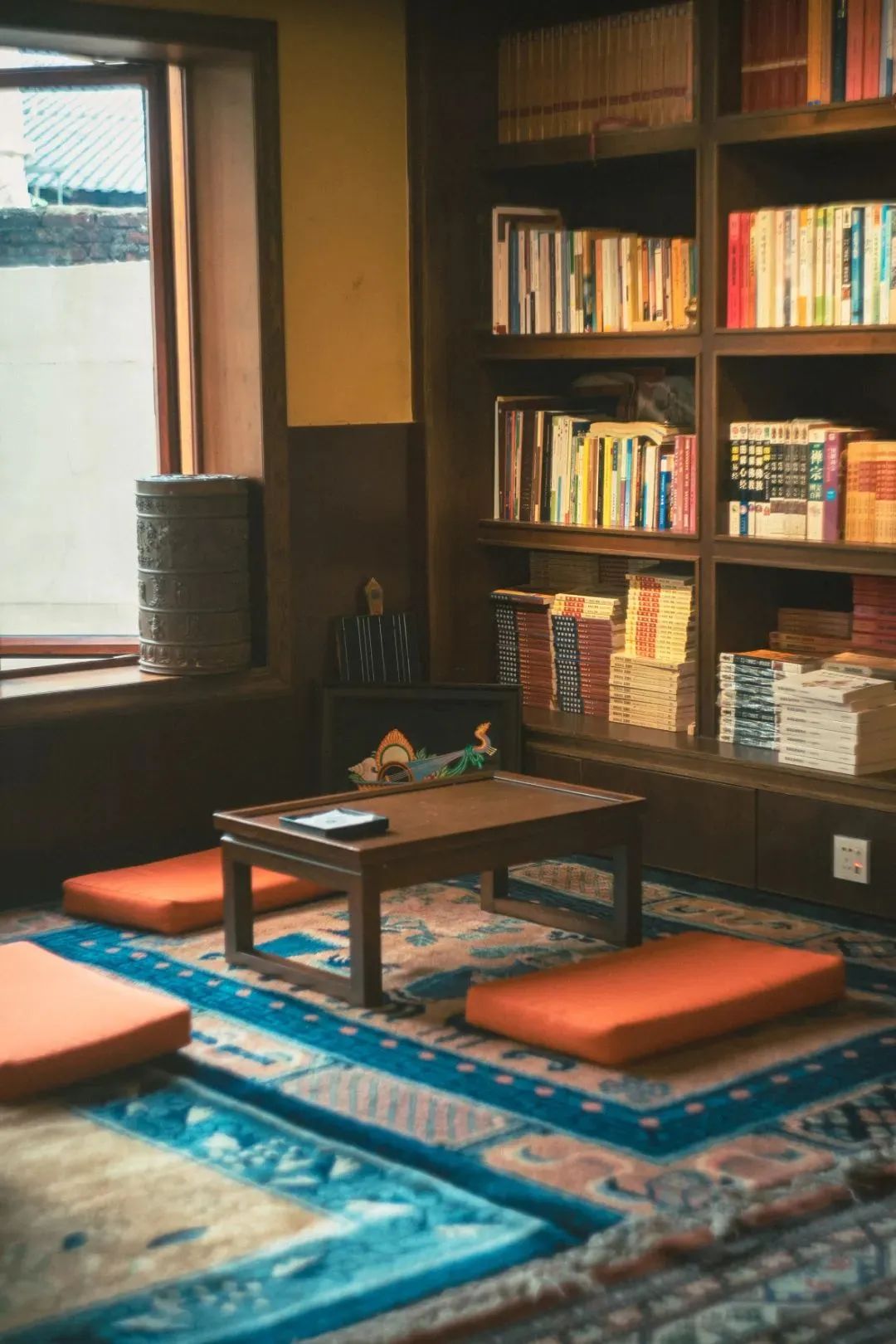登山歸來,品一杯香氣撲鼻的藏茶,讓身心都得到舒緩。依熹拉姆藏茶館內(nèi),有可以席地而坐的地臺(tái)、整面墻的書架,充滿了濃郁的藏式風(fēng)情。