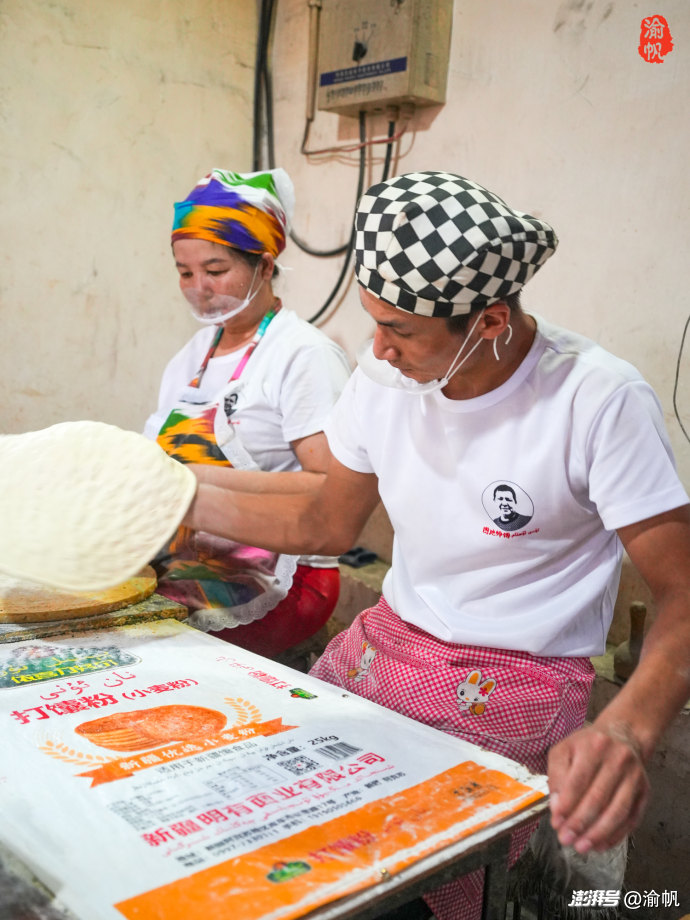 在大馕小巷,我們有幸參觀了打馕的全過程。一間間打馕工坊,師傅們熟練地將備好的面粉和成面團,然后將面團打成圓餅狀擺在桌上。接著,他們把面餅扔給下一道工序的工人,盤成中間薄、邊沿厚的形狀,在中央戳上精美的花紋。