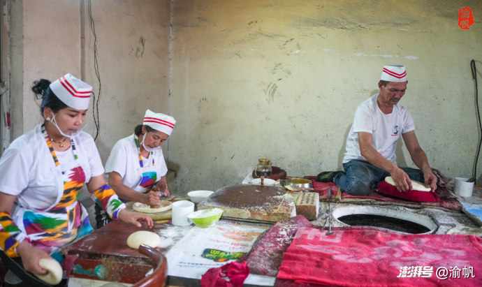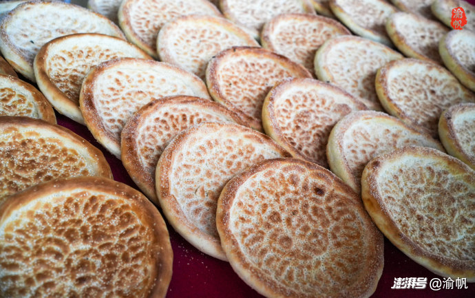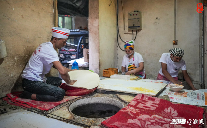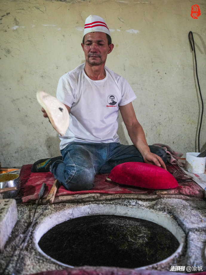 隨后,他們又在面餅均勻地灑上芝麻等佐料。準備就緒后,迅速地將面餅貼在燒熱的馕坑內壁上。不一會兒,馕坑中便飄出了誘人的香味。大約 5 至 10 分鐘后,一個個色澤金黃、香氣四溢的大馕就新鮮出爐了。