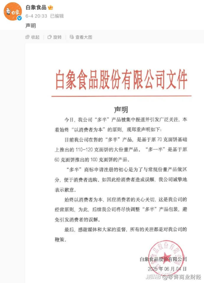 白象方面表示:目前在售的“多半”產(chǎn)品,是基于原70克面餅基礎(chǔ)上推出的110-120克面餅的大分量產(chǎn)品?!岸嘁话搿笔腔谠?0克面餅推出的100克面餅的產(chǎn)品。“多半”商標申請注冊的初心是為了與常規(guī)分量產(chǎn)品做區(qū)分,便于消費者選購。“如因此給消費者造成誤解,我公司誠摯地表示歉意”。