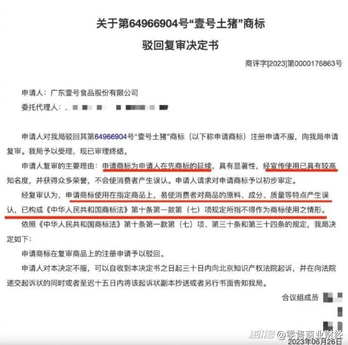 圖:“壹號土豬”商標申請被國家商標局駁回