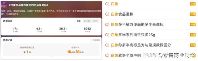 6月4日,“白象多半桶方便面的多半是商標”話題登上微博熱搜第一,閱讀量超1.7億,相關(guān)討論超4.6萬條。