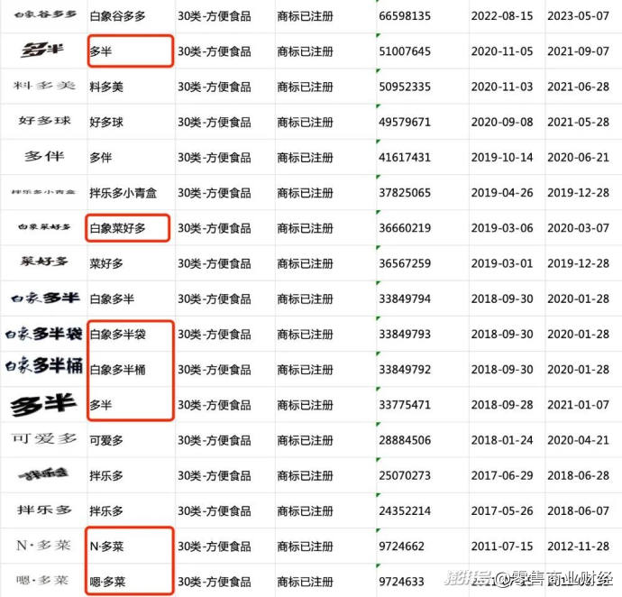 「零售商業(yè)財經(jīng)」檢索發(fā)現(xiàn),“多半”實為白象于2020年11月申請、2021年6月成功注冊的商標,核定使用于第30類方便食品。白象還系統(tǒng)性布局了“白象多半袋”“白象多半桶”等衍生商標,形成產(chǎn)品系列標識。