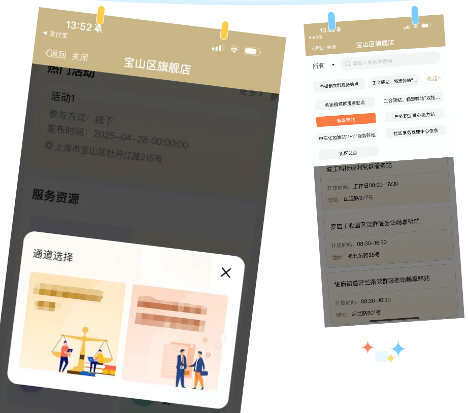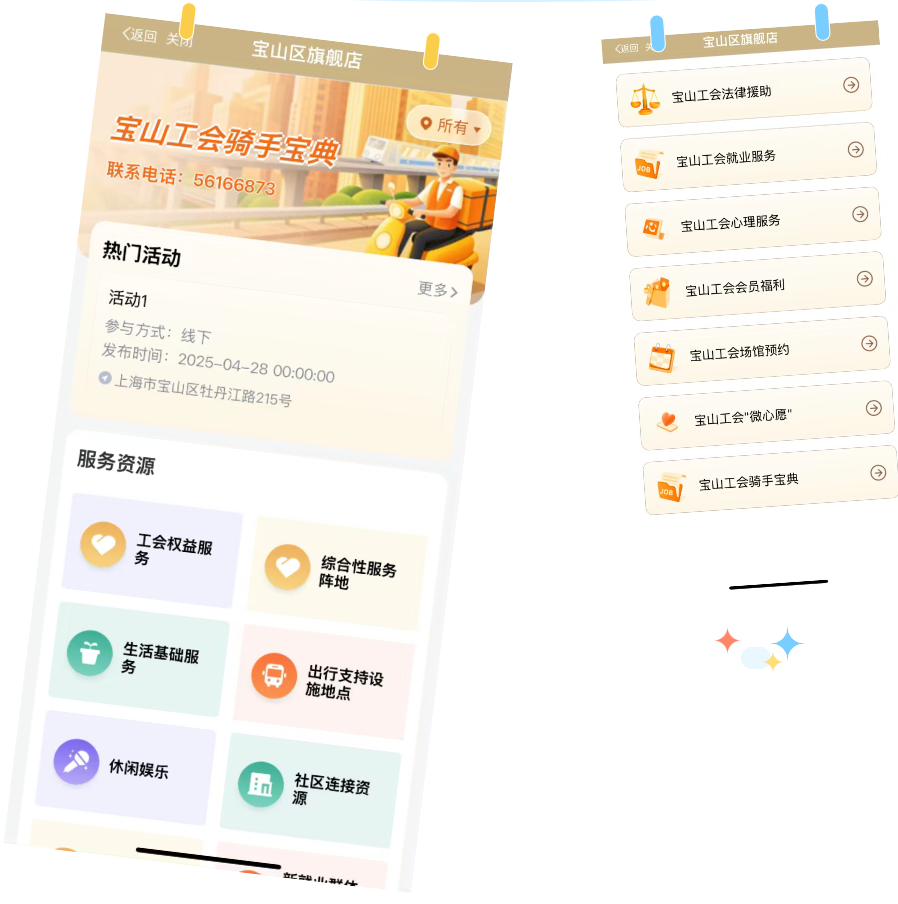 綜合性服務(wù)陣地整合寶山全區(qū)各街鎮(zhèn)、社區(qū)服務(wù)站點(diǎn)信息,確保騎手能夠快速定位、及時(shí)獲取服務(wù)支持。