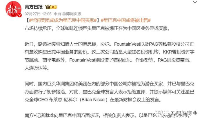 事實上,早在去年,星巴克中國就被曝有出售股權(quán)的可能性;在今年2月,星巴克中國再次傳出要出售業(yè)務(wù)。