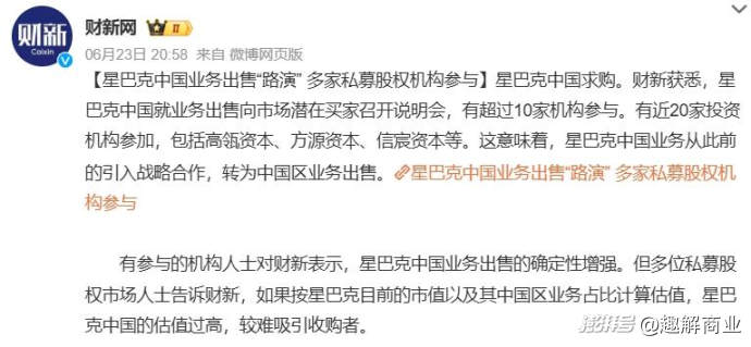 6月11日,星巴克CEO布萊恩·尼科爾(Brian Niccol)表示可能出售中國業(yè)務(wù)部分股權(quán),以吸引外部投資者并恢復(fù)其在華增長。