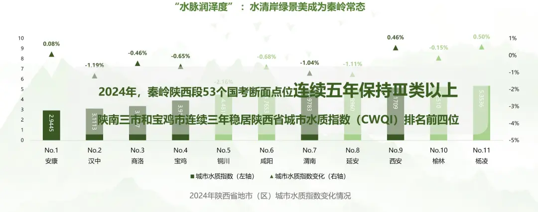 2024年,秦嶺陜西段生態(tài)環(huán)境優(yōu)良等級面積占比達到99.4%,生態(tài)質量指數(shù)達到82.22,生態(tài)本底愈發(fā)穩(wěn)定。位于秦嶺腹地的陜南三市空氣優(yōu)良天數(shù)不低于320天,遠高于全省同期平均水平。秦嶺陜西段53個國考斷面點位連續(xù)五年保持Ⅲ類以上,漢江、丹江等南水北調中線工程主要水源出省斷面水質穩(wěn)定保持在Ⅱ類,“護一泓清泉永續(xù)北上”秦嶺擔當不斷彰顯。