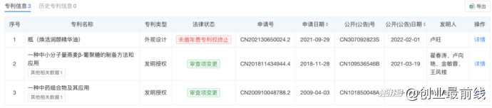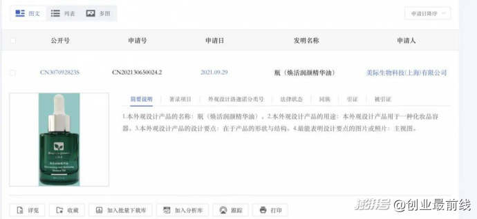天眼查顯示,百植萃由美際生物科技(上海)有限公司(下稱:美際生物)持有。國家知識(shí)產(chǎn)權(quán)局及天眼查信息顯示,美際生物自主申請并獲得的專利僅1項(xiàng)——2021年9月申請的煥活潤顏精華油外觀設(shè)計(jì)專利,且該專利因未繳年費(fèi)已終止。此外,百植萃在2010年、2021年有兩款發(fā)明專利,但均為授權(quán)獲得。