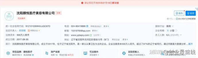 值得注意的是,天眼查顯示,愛美醫(yī)生的開發(fā)公司沈陽易聯(lián)嘉美科技有限公司已注銷,顏悅醫(yī)美品牌公司沈陽顏悅醫(yī)療美容有限公司已于兩天前被注銷。